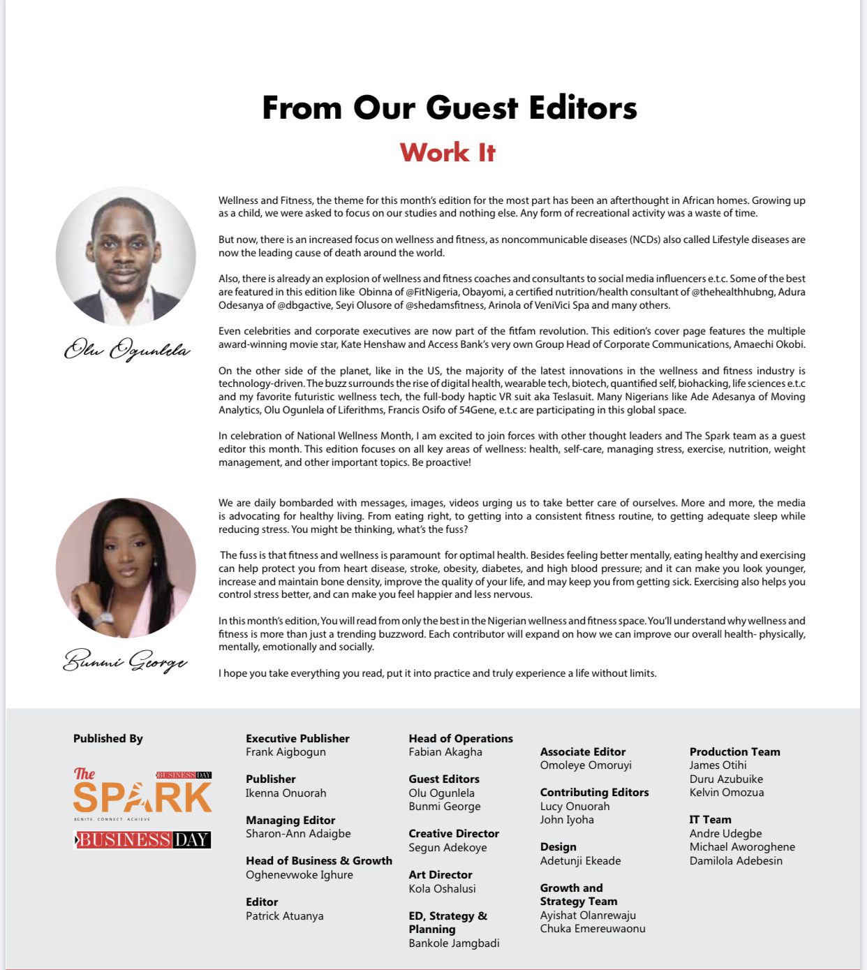 Bunmi George did the honors of editing the fitness edition of the Spark Magazine for Business Day newspaper. Here’s a video about what the edition is about and why she was chosen for this position.